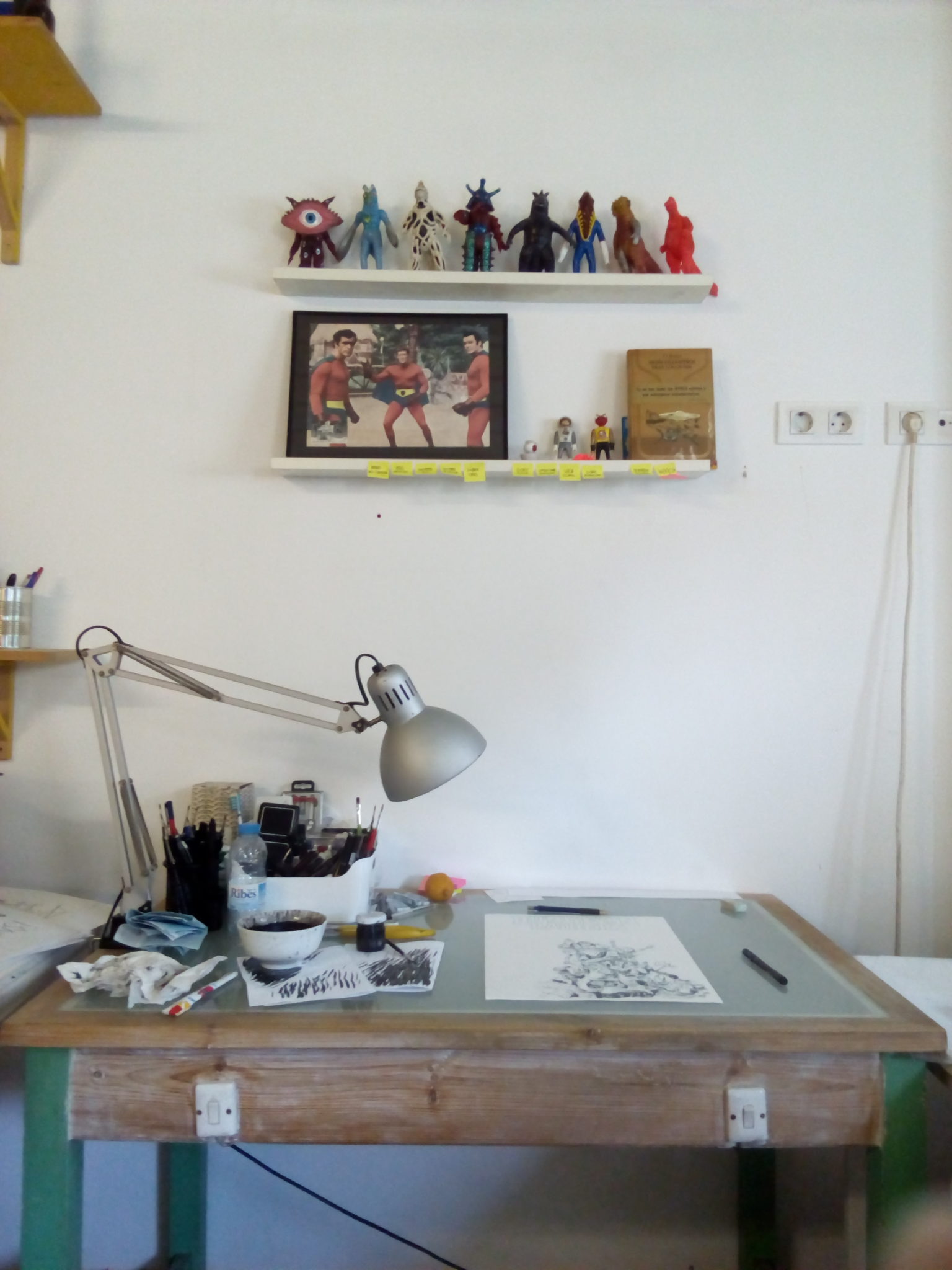 Mi mesa de dibujo es un desastre total. Es una mesa de luz que se construyó mi tío en los años 60 (en esa época él hacía diseño de estampados) y que me regaló hace poco. Le tengo un cariño enorme porque de pequeño esa mesa me flipaba.