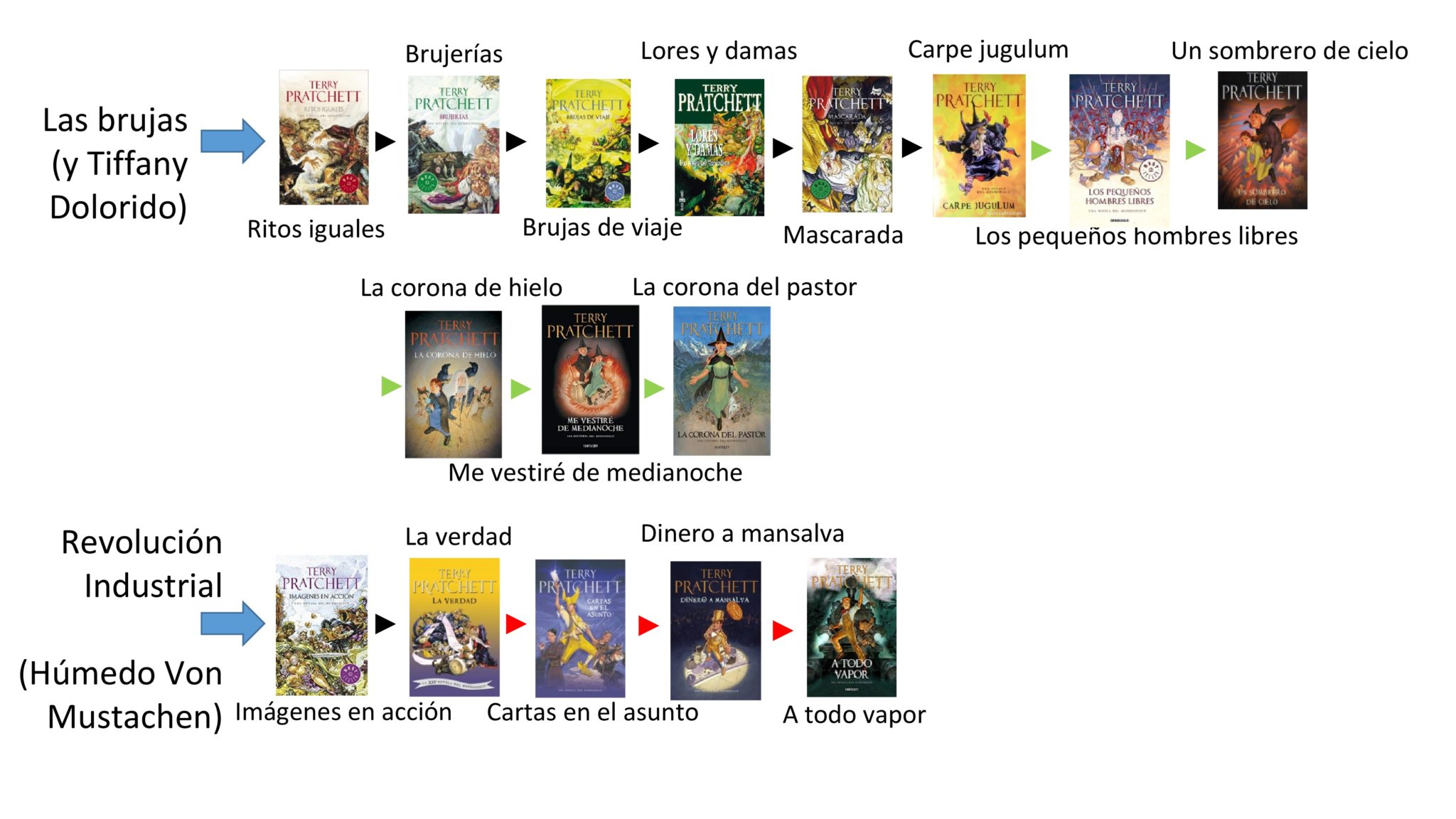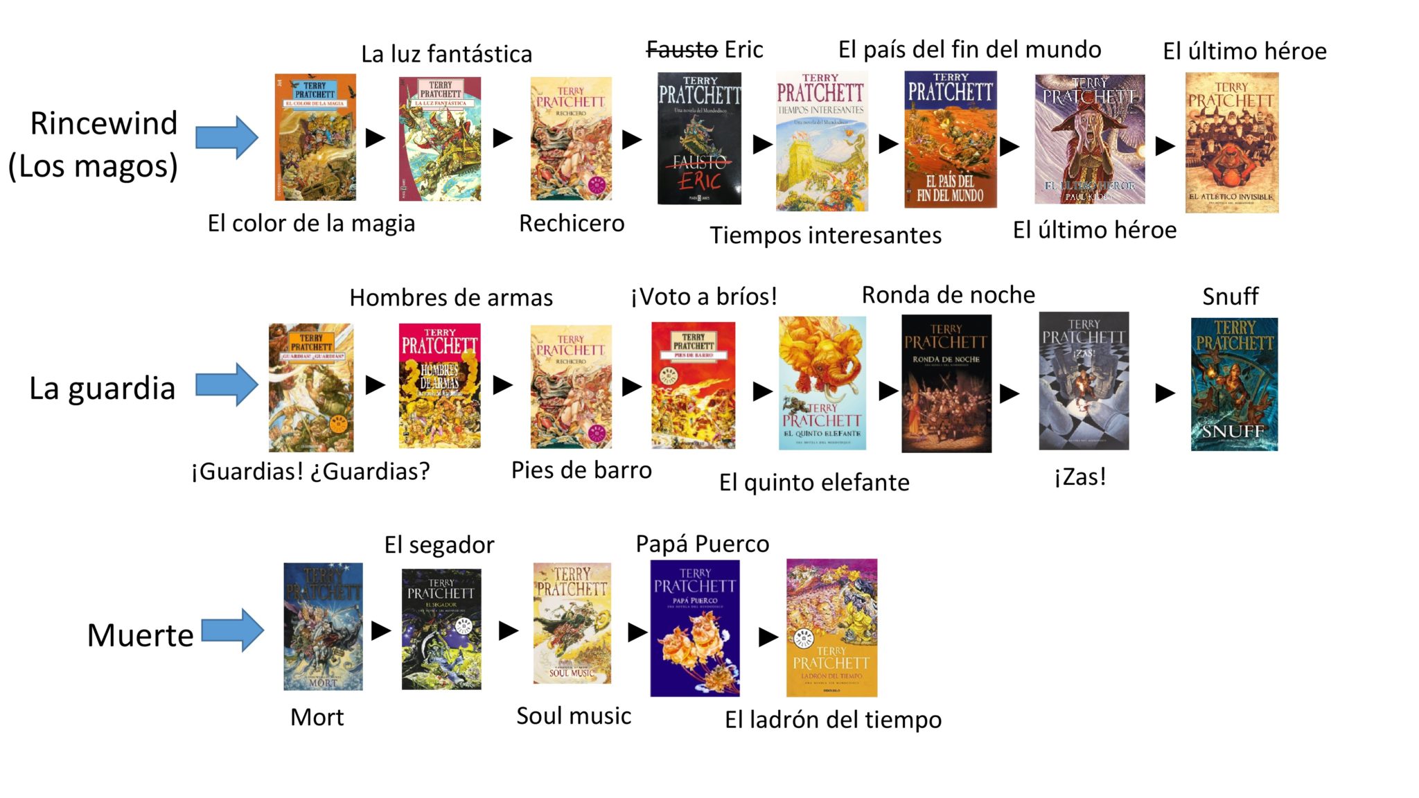 Como decíamos ayer Mundodisco es extenso e intenso y sus libros se han clasificado en sagas, en una guia de lectura. Pero la división nunca fue algo oficial, aunque Pratchett se refiriera a ella (gracias por la referencia a @nosigaleyendo). Además el listado incluye todos los libros publicados de Mundodisco, incluso los infantiles (regalar «Where is my cow?» da puntos)… permitan… voy a realizar algún cambio.