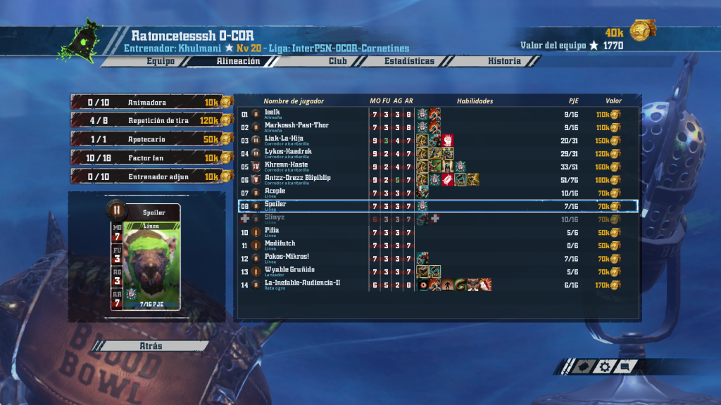 Millán ha optado por skavens con thrower y Rata ogro… esto convierte a su escuadra en un hatajo de ratas imprevisibles y versátiles. Puede buscar el pase o la carrera, y la rata ogro puede abrir huecos por pura fuerza bruta allí donde no baste la agilidad. Como es habitual, el conjunto está construido en torno a sus corredores… ahí destacan una +1 AG y Manos seguras (el ball carrier ideal) y una +1 FUE y Forcejeo, un sacker muuuy peligroso; la cuadrilla la cierran una one turner y una receptora con Nervios de acero. Sus tres jugadores de banquillo terminan de apuntalar este peligroso equipo.