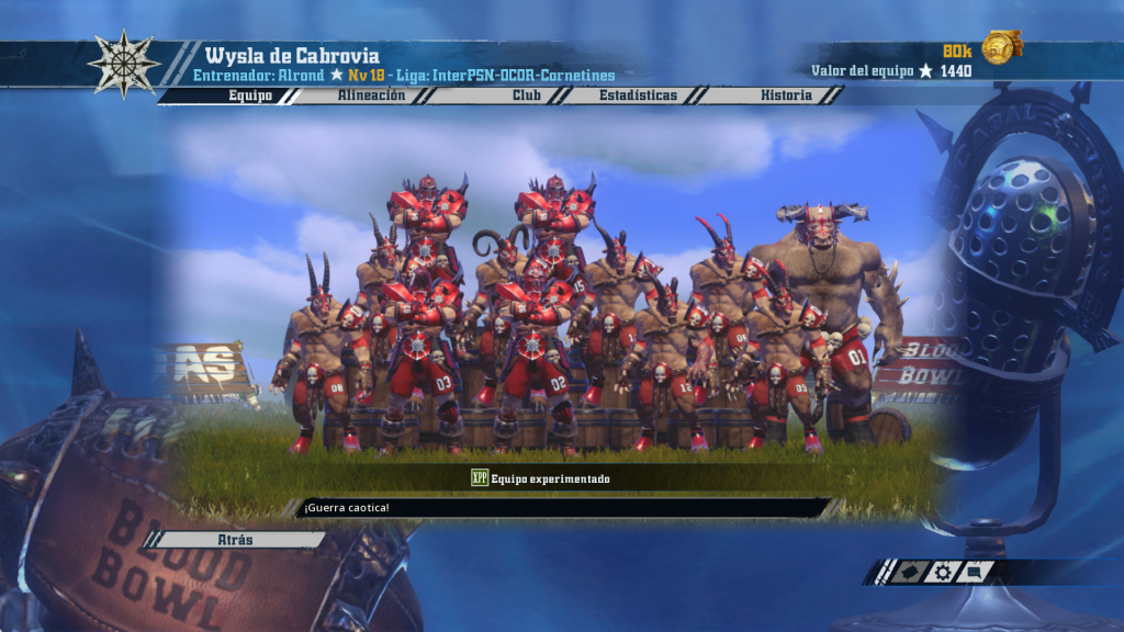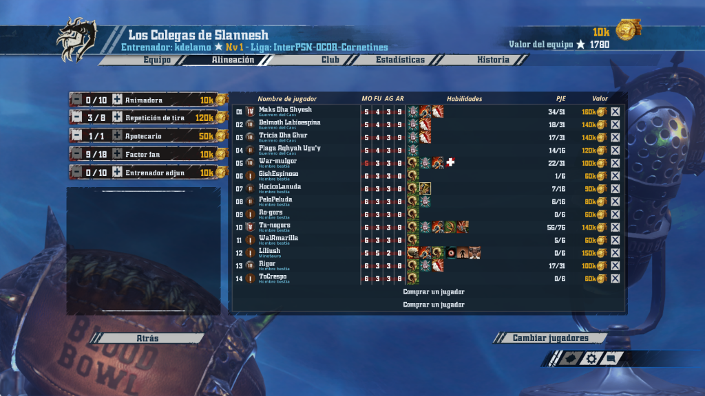 Álvaro ha optado también por Caos con mino y una decisión arriesgada: sacrifica precisión a cambio de pegada, sólo una cabra con block. El resto confían en su Golpe y su Garra apoyados por algunos jugadores con Guard. Mientras el mino con Juggernaut y Garra va a suponer más de un disgusto a los rivales y gana fiabilidad en los blitz. Cuenta con una cabra +MOV y +FUE cuya evolución habrá que seguir de cerca. En resumen, un equipo que ha sido construido (en parte) como una moneda al aire… Puede reventar a cualquiera en un día bueno…