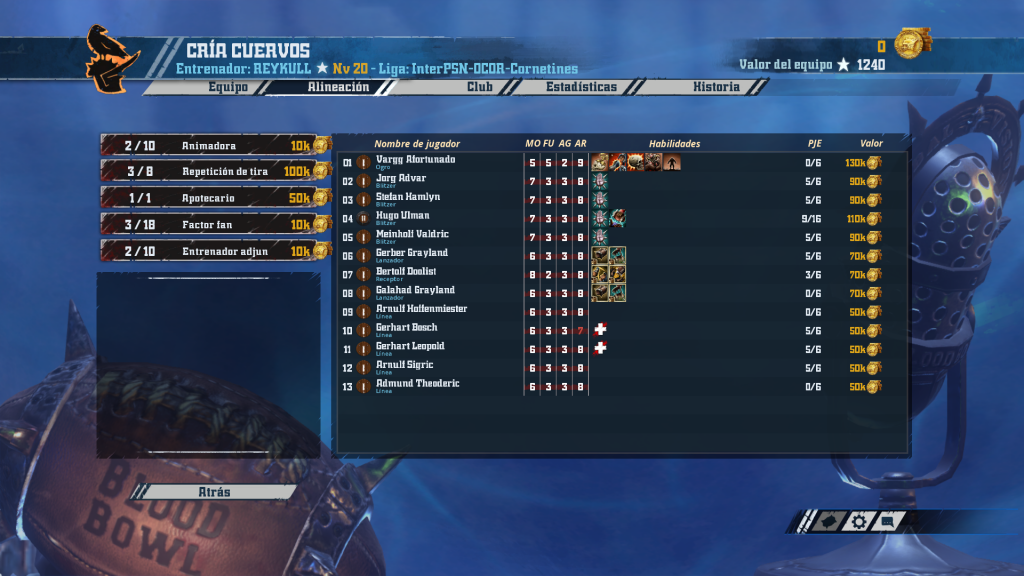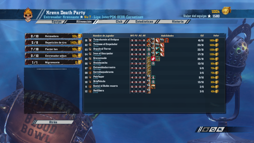 Los no muertos de Marc, un entrenador que está yendo de menos a más. Ha optado por la versión más veloz de este equipo, con hasta cuatro necros (a destacar su ball carrier con +AG y Manos seguras, si sobrevive hasta pillar Block será un gran jugador). El núcleo duro lo forman sus momias y tumularios con «defensa» las cuatro, un auténtico muro…. En la construcción del equipo algunas decisiones discutibles, como las momias juggernaut o ese quinto reroll (¿compensan el incremento de TV con lo que aportan?) En cualquier caso, está llamado a hacer cosas interesantes esta temporada.