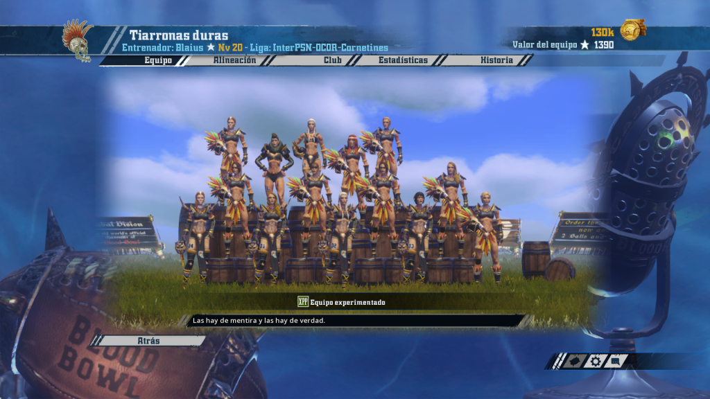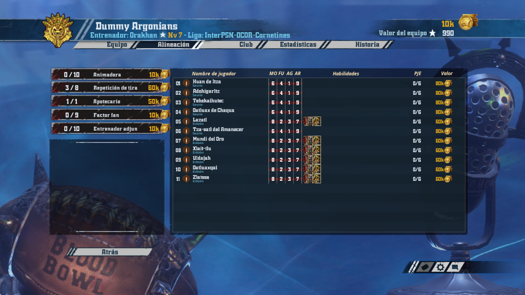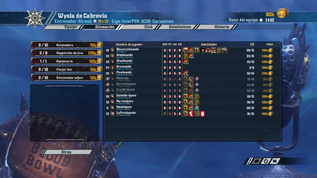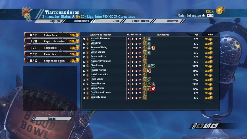 Blai cambia sus nurggle por amazonas. Este equipo con mucho recorrido por delante está asentando cimientos sólidos, con 4 rerolls y catorce jugadoras. La clave de su juego estará en la confianza en Blodge, hasta siete jugadoras (incluyendo forcejeo) tienen ya este preciado combo “me-pegas-una-de-cada-seis”. Como es típico, empiezan a asomar ya las jugadoras con Defensa (dos). Su receptora de AG 4 y tres blitzers todavía rookies permiten pensar que si Nuffle y las armaduras se comportan, en unos partidos las chicas pueden dar un salto adelante en calidad.