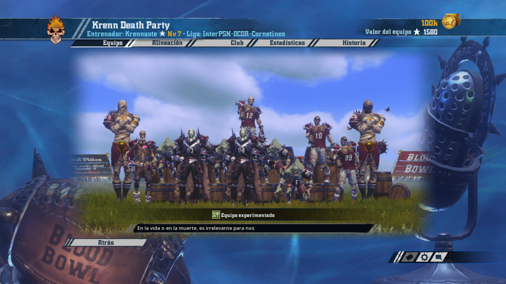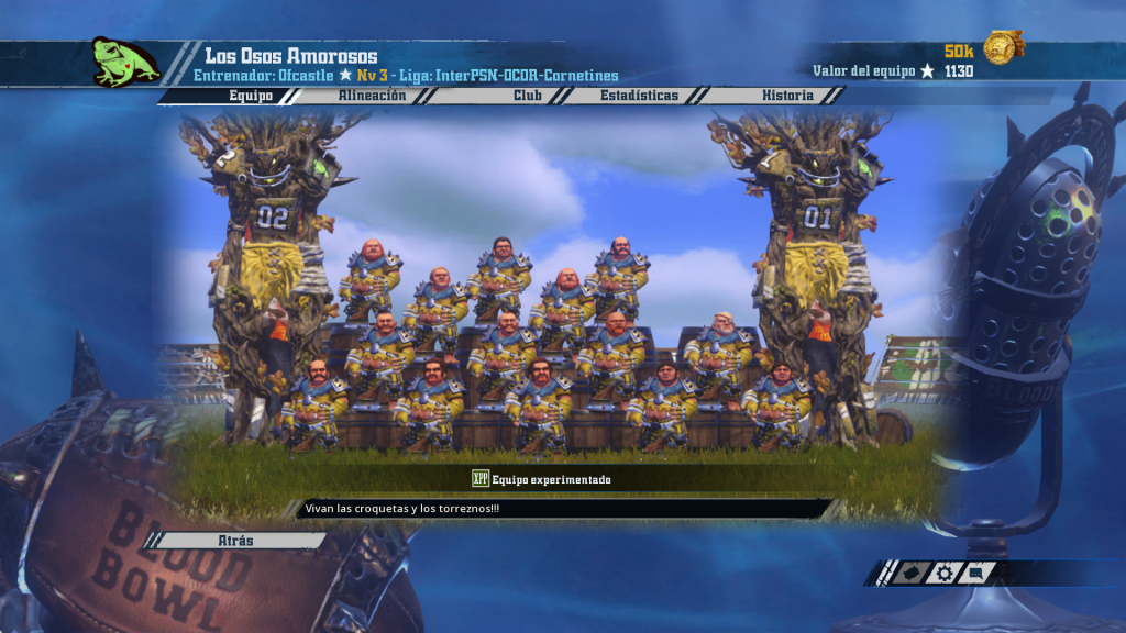 Carlos ha diseñado una máquina de picar carne. Hasta cuatro jugadores con Defensa y un montón de Golpe poderosos y Garra garantizan un festival de sangre y gritos. Y por si faltara pegada, añadamos un minotauro. A destacar la cabra killer pura (Block, Golpe, Garra y Aplastar). Tal vez en cuanto a diseño de equipo, es discutible hasta qué punto son necesarios tres reservas con gente tan dura de pelar y por ahí se le dispara un poco el TV (aunque también es cierto que la liga pasada era muuuuy bash) Le falta todavía un jugador más orientado a llevar el balón para alcanzar la perfección como conjunto.
