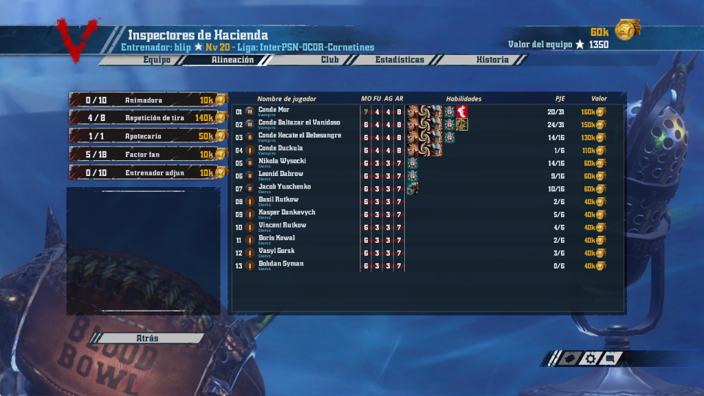 Andrés, el entrenador más regular de la liga, se atreve con vampiros ¿Cuán cara pagará su osadía? En los primeros compases de la competición necesitará ser hábil con los incentivos y un buen montón de suerte. Cuatro chupasangres tiene en sus filas, todo apunta a que dos de ellos serán los puntales del equipo: uno con +MOV, y otro con Blodge. Nueve siervos con algún que otro Block y Forcejeo para darle más aguante y cuatro repeticiones de tirada acaban de completar este ejército de las tinieblas… ¿Será suficiente para aplacar la insaciable sed de sangre vampírica?