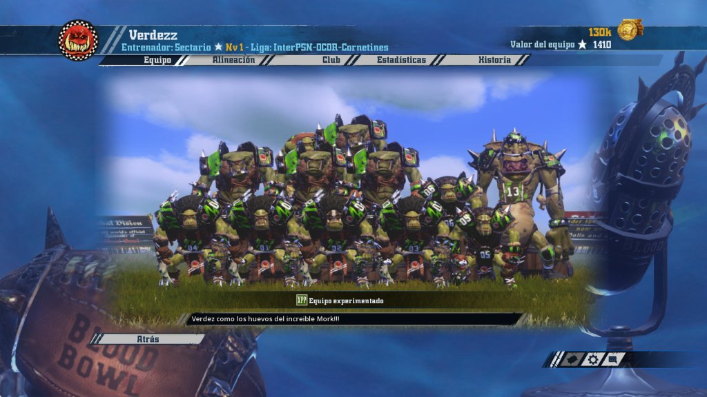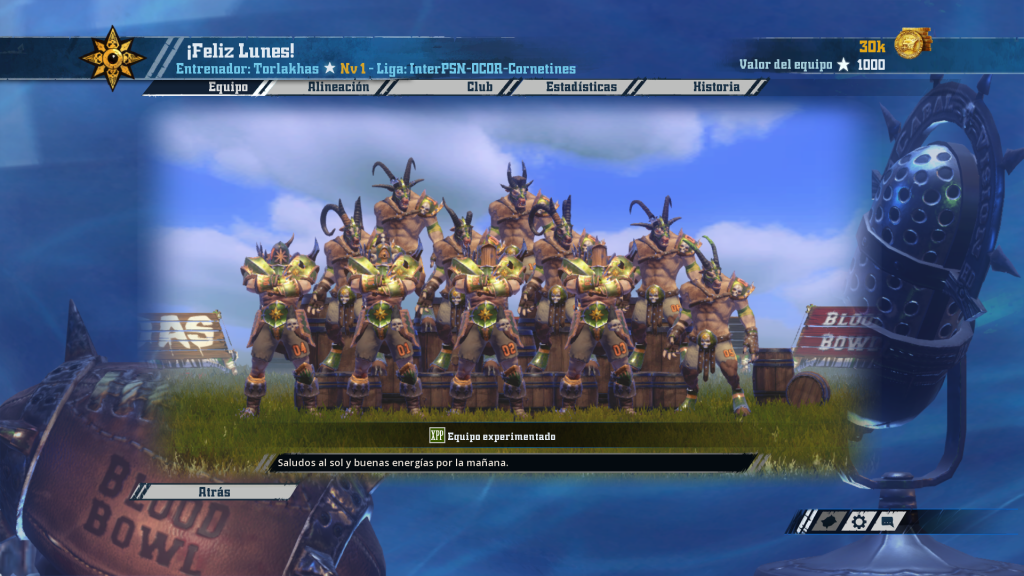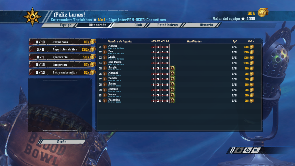 Héctor, el entrenador novato, se planta en esta nueva liga con un equipo recién salido del horno… ¿Qué puede salir mal? ¡Feliz lunes! presenta el que posiblemente sea el roster inicial más sólido posible con caos: cuatro guerreros, siete cabras y tres rerolls. A partir de ahí, diez jornadas de aprendizaje que Héctor afrontará con su habitual buena actitud. En más de un partido el Apo extra será obligado en la fase de incentivos.