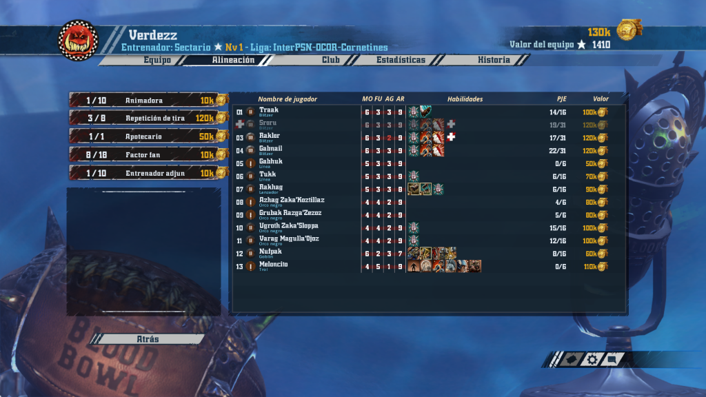 Marco opta por la variante orca de troll y goblin, que siempre da algo más de imprevisibilidad a los pieles verdes. Su thrower con Block aporta seguridad con el balón. El alma del equipo son sus tres blitzers con Defensa y Golpe, capaces de matar y apoyar a la vez, un par de orcos negros con Block acaban de añadir pegada, y su goblin con Jugador traicionero es una auténtica pesadilla para cualquier rival… y por si sufre expulsión o es machacado, ahí tiene un par de líneas suplentes. Un equipo todavía en fase crecimiento que debería alcanzar su madurez esta temporada.