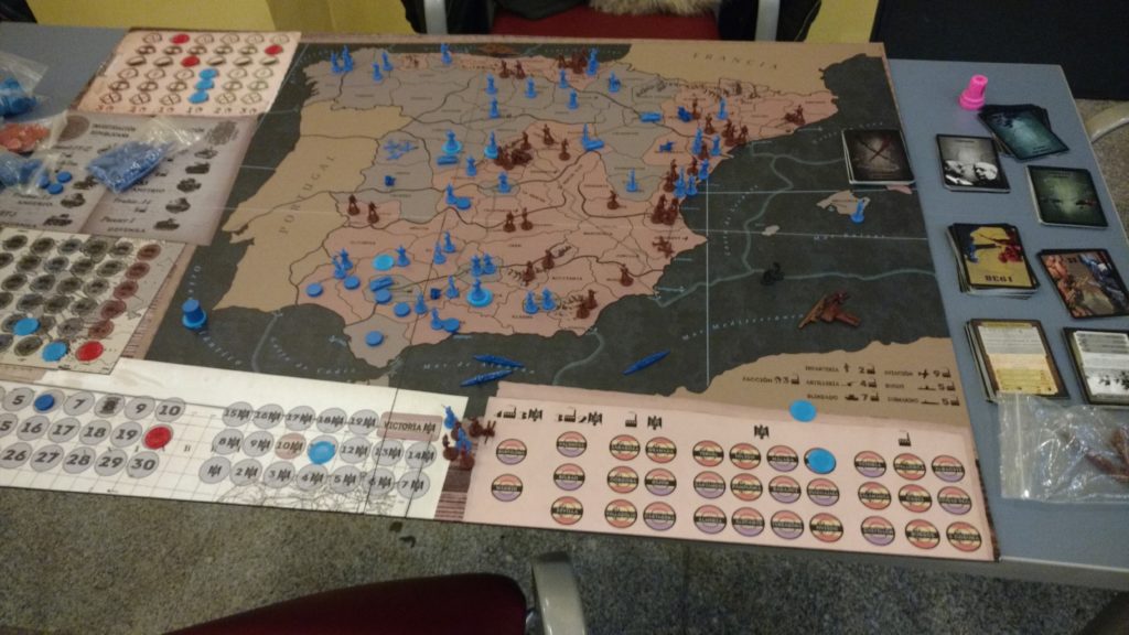 Con todas las características mencionadas. Este prototipo incluye una parte mas «Euro». Mientras los dos jugadores se están pegando entre ellos, tendrán que preocuparse de la política. Sí, en España la política siempre prima aunque haya una guerra civil. Cada jugador tendrá que tener cuidado de las distintas fuerzas políticas que tiene en sus filas, ya que podrán apoyar una guerra para conseguir el objetivo deseado, ¡o podrán empezar un levantamiento entre sus propias filas para derrocar al propio jugador! además, no contentos con esto, las fuerzas extranjeras no se quedarán de brazos cruzados en un conflicto como este. Van a aprovechar a realizar sus disputas mundiales poniendo a España como conejillo de indias. Un cóctel perfecto ¿no?.
