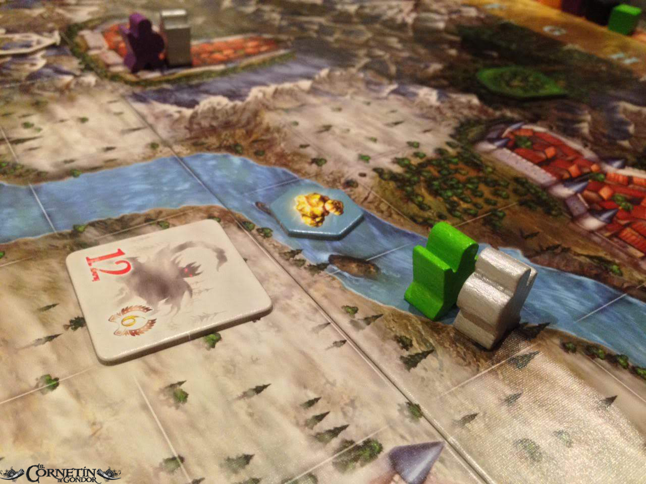 La mecánica consiste en realizar dos acciones cada turno y cada aventurero. La primera es destapar dos cartas de terreno, las cuales indican qué hay que colocar en el tablero (aliados, espadas, hierbas, oro o monstruos) y en qué coordenada, sólo hay dos reglas añadidas: si toca colocar oro (en el río) habrá que colocar el aguador, si es el primer oro, o desplazarlo desde donde se encuentre hasta el nuevo oro a través del río, eliminando a su paso a todos los aventureros y aliados; si sale una carta de niebla (las de los monstruos) habrá que sacar otra carta más, ya que éstas no cuentan para las dos cartas de terreno por turno. Si algo de esto acaba en la casilla en la que hay un aventurero se quedará el botín o tendrá que luchar o será eliminado por el aguador.
