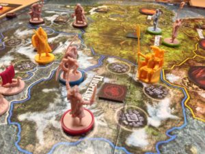 Cada raza tendrá un tablero personal donde ir desarrollando sus guerreros, líderes, monstruos, etc… además de ir mejorando su furia (es lo que marca cuántas acciones podrás hacer), hachas (la fama que te llevas por ganar combates) y/o cuernos (número de minis que puedes tener en juego a la vez). Vamos, que además de las mayorías tienes que gestionar las acciones de que dispones y en qué es más efectivo gastarlas para ganar fama, y aquí está el quid del juego.