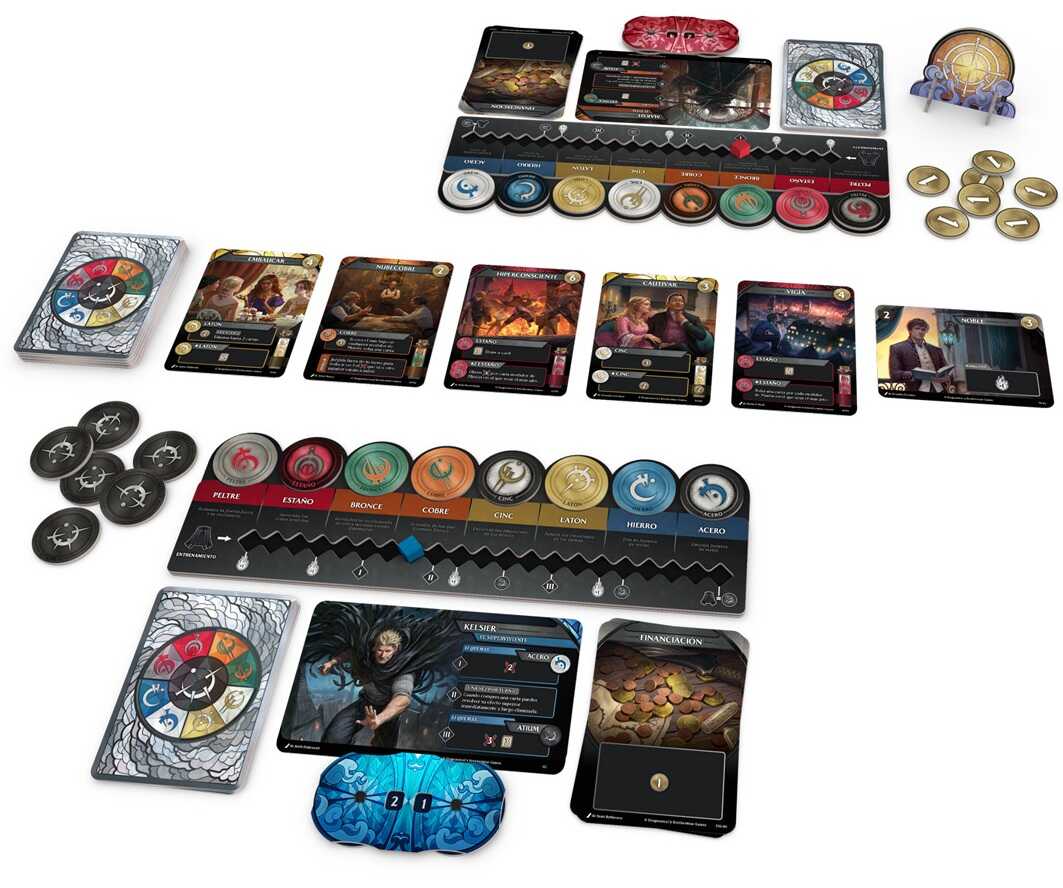 Cada uno de los ocho metales principales tiene un espíritu diferente. Así, por ejemplo, el Peltre nos trae Aliados para defenderos o Acciones para curar y hacer daño. Aparte queda el Atium que, por una parte, sirve de comodín y, por otra, permite realizar Acciones muy potentes. En tu turno puedes usar los metales de maneras diferentes: