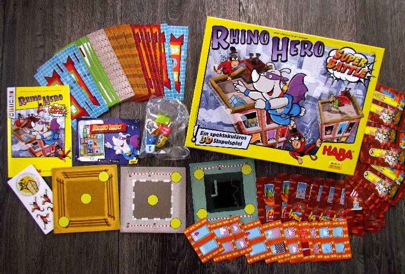 Rhino Hero, Super Battle, es el hermano mayor de Rhino Hero. Brilla por una simpleza que lo hace adictivo para pequeños y también para mayores. Por turnos, cada jugador cogerá uno de los suelos disponibles, donde se indicarán el número de paredes a colocar y los monos araña a colgar. Después, deberá colocar todos los elementos en el rascacielos que los jugadores están construyendo, de manera que se cree un nuevo piso. Una vez hecho tu “hero” puede intentar subir uno o dos piso y enfrentarse al “hero” de otro jugador si se encuentra en el mismo nivel. Pierdes si al colocar todos los elementos se cae parte de la estructura y ganas si tu hero esta en lo más alto al acabarse todas las piezas.