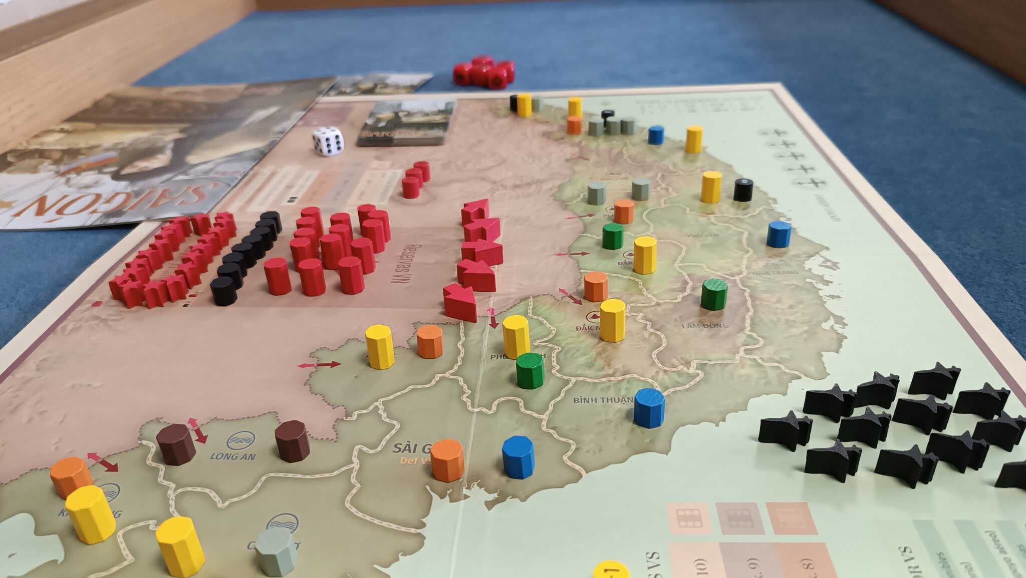 Si comparamos Saigón 75 con Lago en Llamas, este puede parecer sencillo. Lo cierto es que tiene una profundidad estratégica notable con componentes claros y reglas claras.