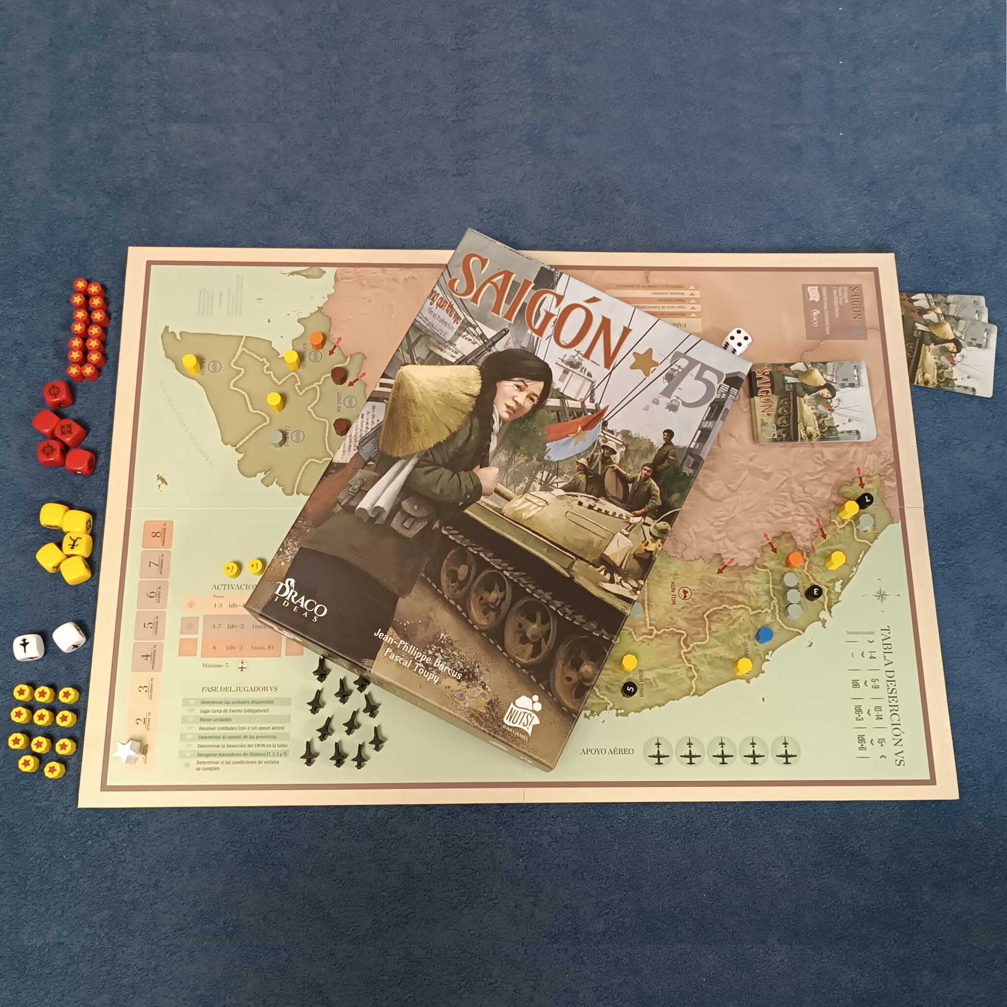 Saigón 75 es un wargame ágil y narrativo que recrea los dos últimos años de la Guerra de Vietnam, desde los Acuerdos de Paz de París (1973) hasta la caída de Saigón (1975). Vietnam del Norte lanza su ofensiva final mientras el Vietnam del Sur intenta sobrevivir sin la ayuda de Estados Unidos.