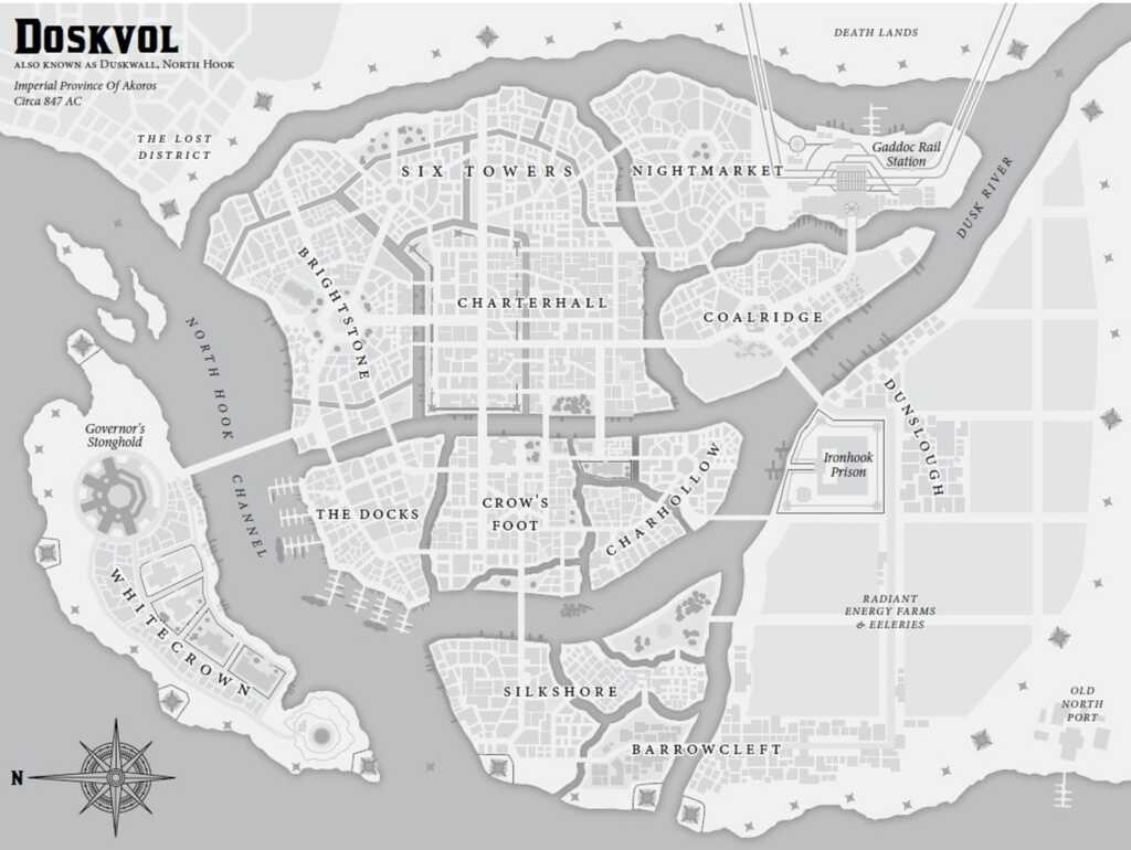 La ciudad de Doskvol se encuentra encerrada por torres de rayos azulados, que evitan los espíritus vengativos y los horrores de las Tierras de la Muerte. Pero esta seguridad tiene un precio. Los generadores deben ser alimentados continuamente con la sangre ectoplasmática de los horrores que habitan el Mar del Vacío.