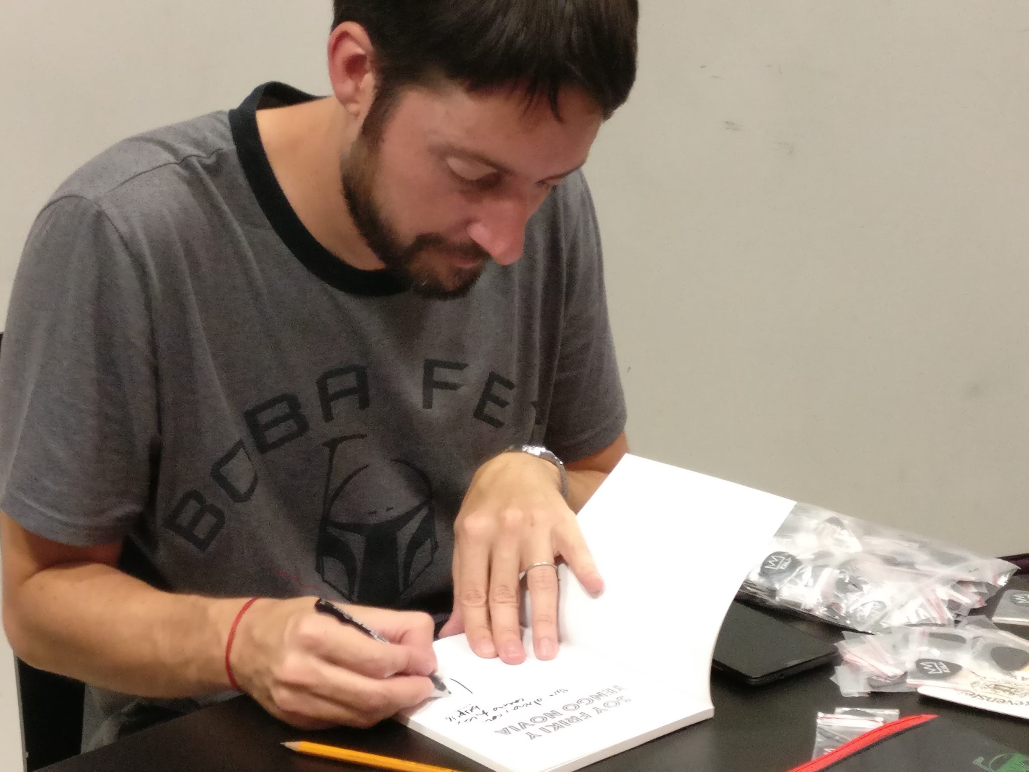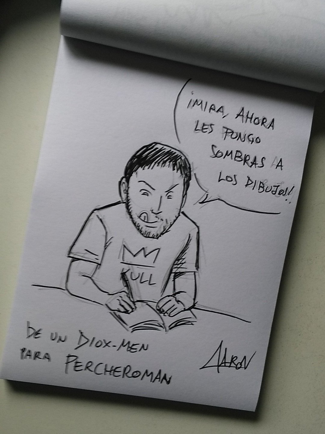 Por supuesto, la sección madrileña de El Cornetín (Aarón Moreno, K del Amo y Juls de Mordor) fue acreditada al evento y pudo sacarse alguna foto con Andrés. De hecho, en un alarde de exceso de confianza, Aarón Ilustrador le dedicó a Andrés su propio #inktober y la Correctora Juls (de Bebé a Mordor) hizo spam ante los presentes para conseguir votos para los Premios Bitácoras.